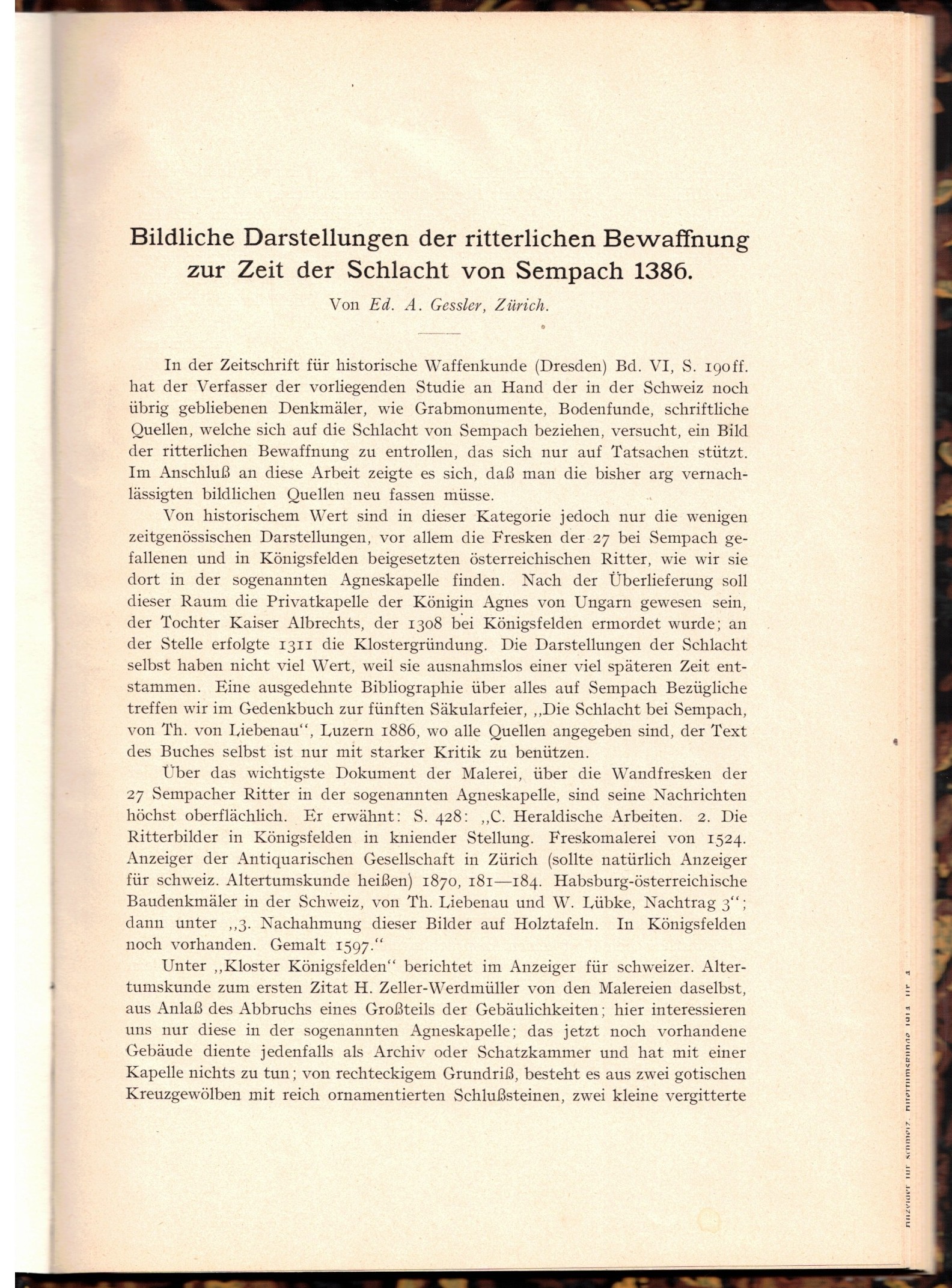 Informationstext: Sammlung von Aufsätzen Gesslers in Anzeiger für Schweizerische Altertumskunde 1910 bis 1924. 1. Bildliche Darstellungen der ritterlichen Bewaffnung zur Zeit der Schlacht von Sempach 1386. 2. Der Zweihänder. Eine waffengeschichtliche Studie mit besonderer Berücksichtigung Basels. 3. Vom Kreuzdegen. 4. Die sogen. Lederkanonen aus dem Zeughausbestand der Stadt Zürich. Sauber. Leichte Altersspuren. Versand als DHL Paket. Rechnung mit MwSt.