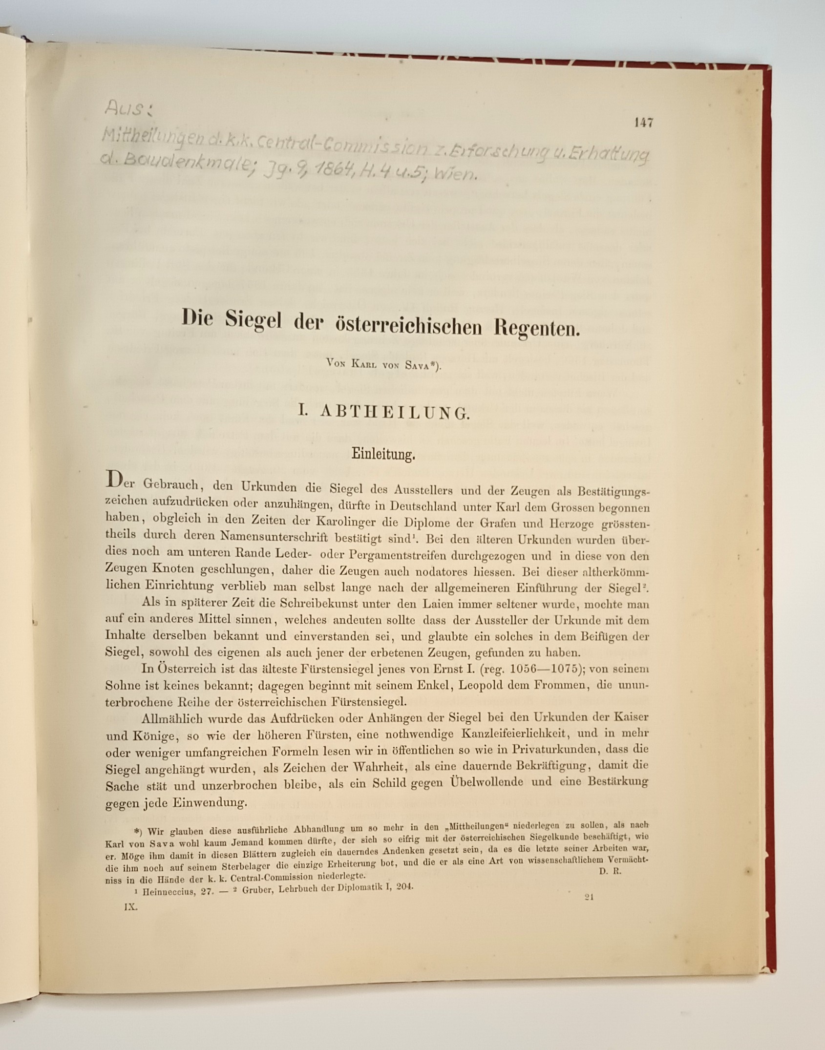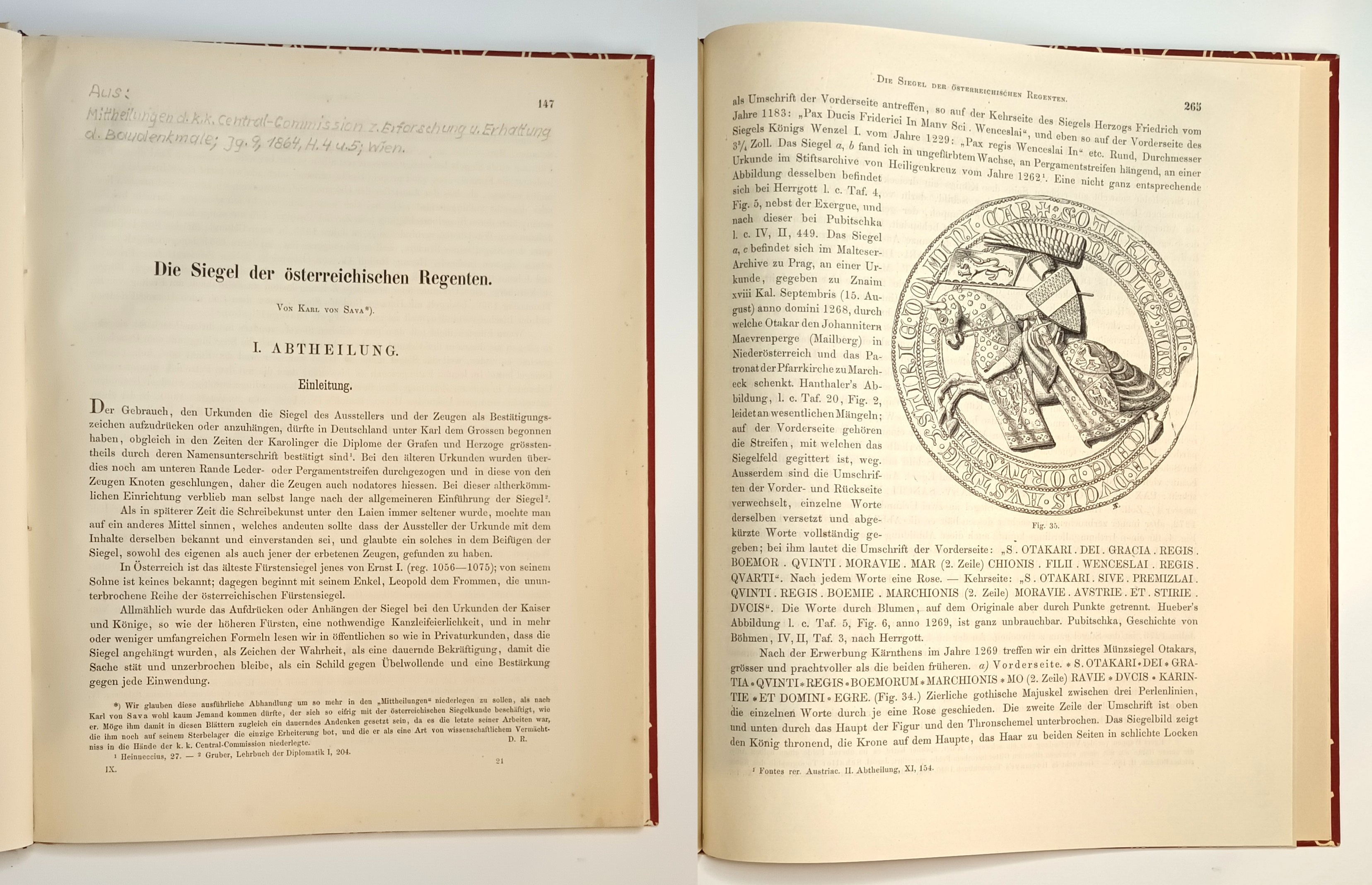• 1. und 2. Abtheilung. Die Siegel der österreichischen Fürsten aus dem Hause Babenberg. Aus: Mittheilungen d.k.k. Central Commission zur Erforschung und Erhaltung der Baudenkmale. Jahrgang 9 1864 H 4 und 5 Wien. Sauber sehr gut. Versand in DHL Paket. Rechnung mit MwSt. Gewerbliches Rückgaberecht.